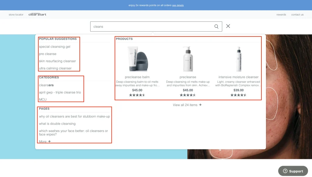 Take look at Dermalogica’s fast search results for more information. A user may access relevant products, related categories, and helpful guides with just a few keystrokes.