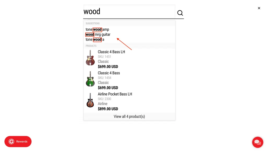 Remember to highlight suggested results for improved scannability, like Eastwood Guitars has done, to make suggestions stand out. By making search words bold in the results, the brand shows how relevant their recommendations are.