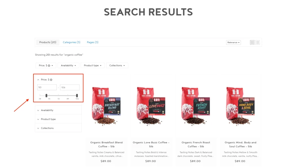 Approximately 80% of consumers filter things based on price, and they typically have an idea of how much they can spend. Equal Exchange provides shoppers with a price filter that includes a range slider and price range alternatives. (Source: Equal Exchange)