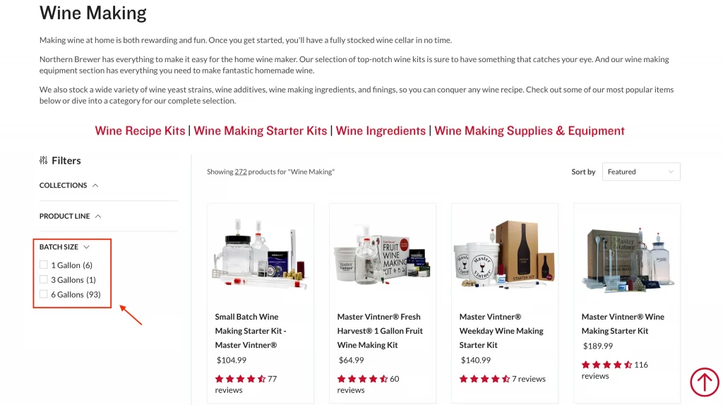 Because your customers can swiftly eliminate things that aren’t right for them, size is an important feature. Northern Brewer creates a size filter for wine-making kits so that online customers can choose whether or not they meet their needs. (Source: Northern Brewer)