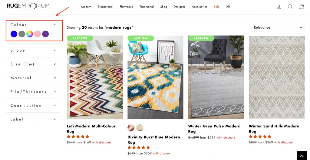 People have color preferences, therefore never let them down by allowing them to purchase a product in unfavorable tones due to a lack of color filter options. (Source: Rug Emporium)