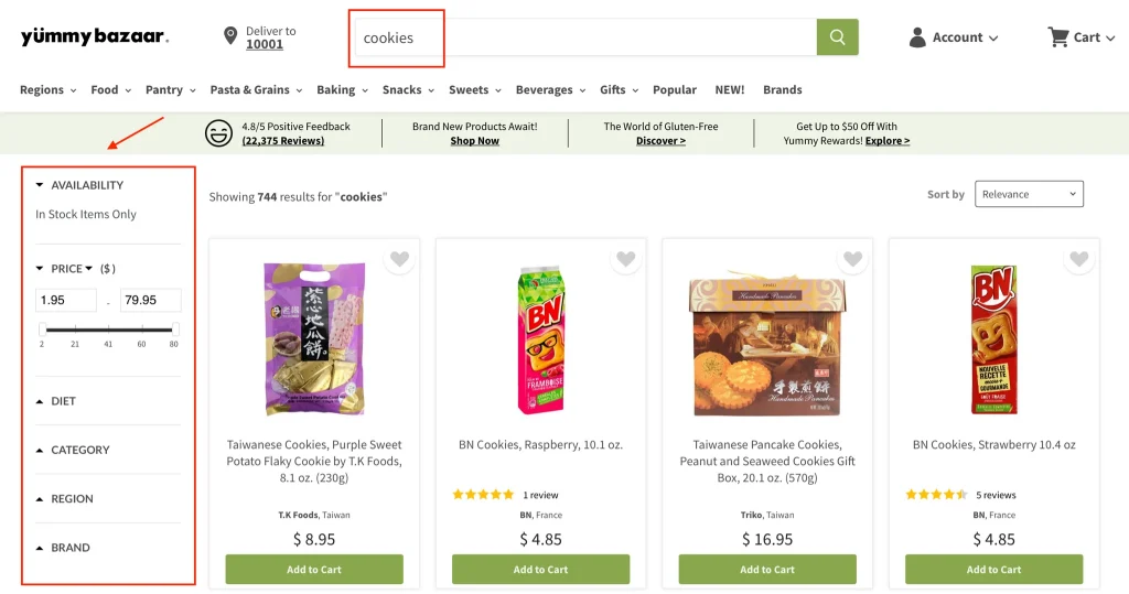 No one has the time or patience to scroll down and look at over 700 cookie options. To that end, Yummy Bazaar provides their online customers with a clever solution in the form of faceted filters, which reduce the number of results based on their preferences. Customers simply need to select their preferred diet, brand, price range, and region.