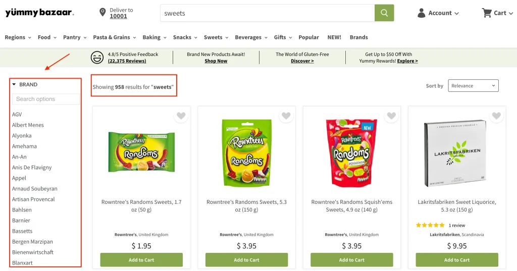 Brand awareness is widespread, especially in the fashion, cosmetics, and food and beverage industries. When looking for something new to try, people are more likely to look for well-known names. A brand filter with a search box, such as the one used by Yummy Bazaar, makes it easier for clients to find the items they want without having to keep scrolling down. (Source: Yummy Bazaar)