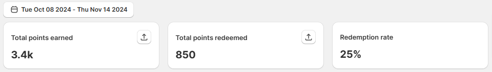 - Redemption rate: This metric shows the percentage of points that customers have redeemed at the store, calculated by dividing the total points redeemed by the total points earned.