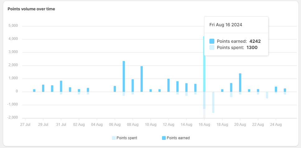 - Points volume over time: the total amount of points awarded or redeemed within your loyalty program over a specific timeframe.