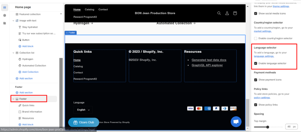 BON Pro Tip: You can enable or disable the language selector by navigating to your Published theme > Customize > Footer section > Select/Unselect the option to “Enable language selector” > Save.