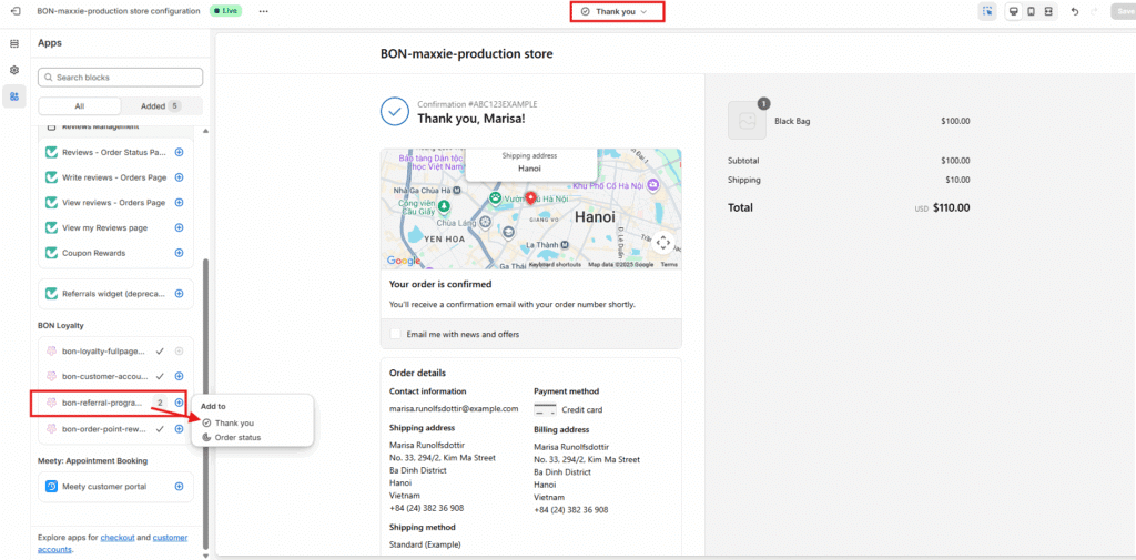 - As you are already in the editing tab for Checkout and customer account, go to Apps > Select extensions called bon-referral-program-extension > Add it to the Order Status page.