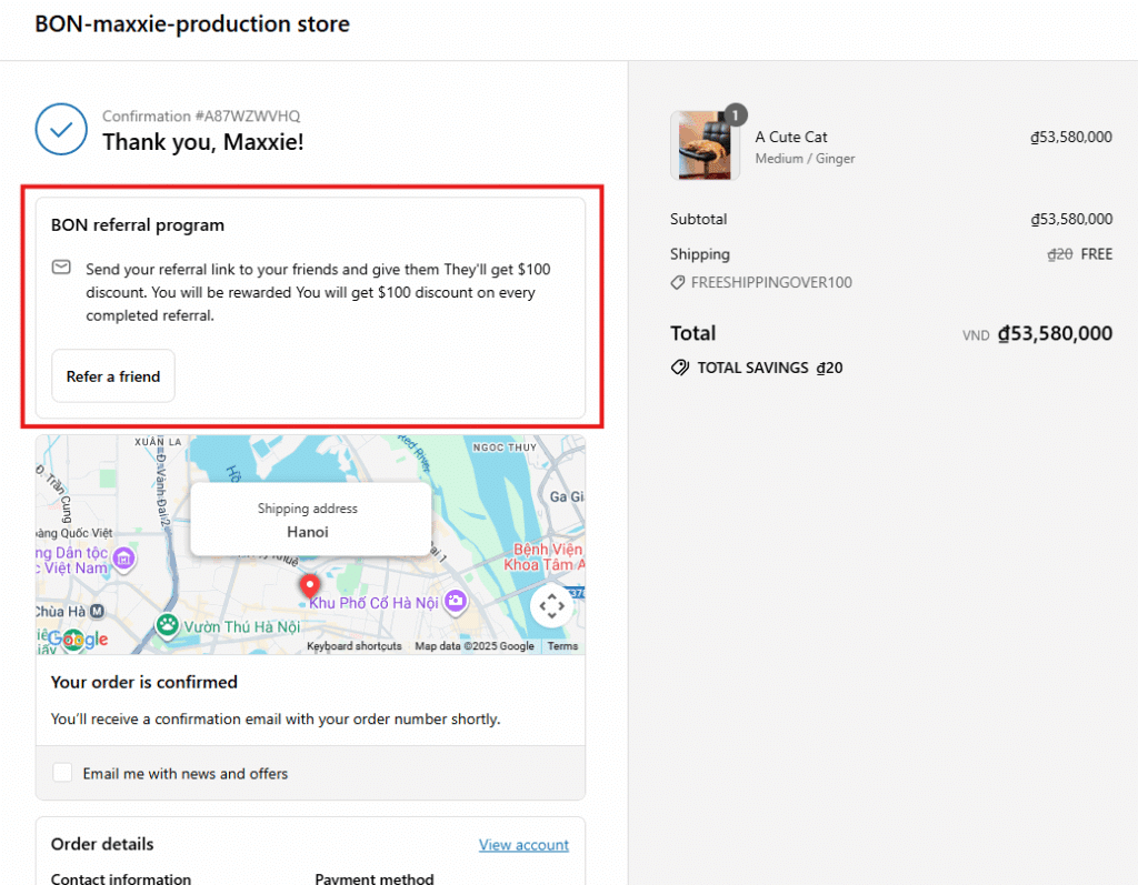 Here’s what the bon-referral-program-extension appears on the actual Thank You page.