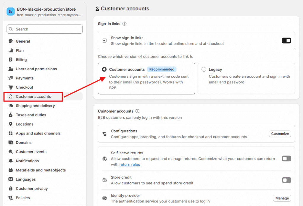 IMPORTANT NOTE: Please ensure that you have activated the Referral Program and rewards in BON > Point programs > Redeem points. Also, in Shopify > Settings > Customer accounts, make sure the Customer Account login type is selected. Otherwise, these extensions will not appear.