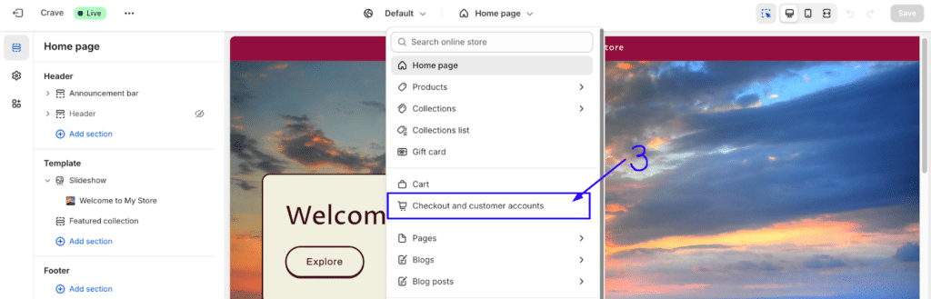 - Select Check out and customer accounts on the page list.