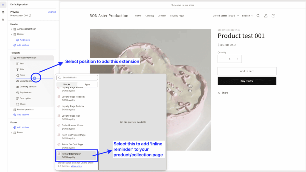 Select the correct Product or Collection page in the Page menu of the Theme editor > Choose the position where you want this banner to appear > Click Add Section/App block > In the Apps menu, scroll down and select the extension named Reward reminder.
