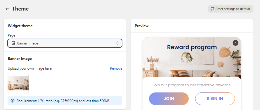 - Show program title: Check this box to display the name of your loyalty program. You can edit this name under Widget Text > Sign-in Page > Section 1. Reward program. Learn how to customize the Widget Text here.