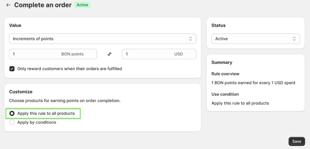 If chosen, make sure orders are marked as fulfilled in Shopify for customers to receive points.