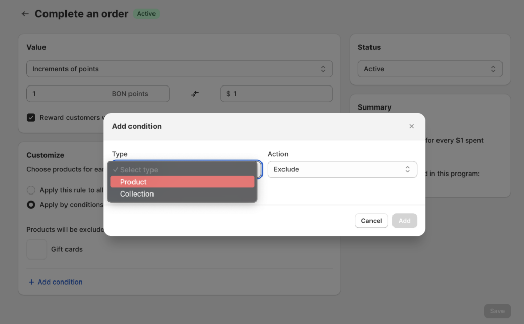 - If certain products or collections are excluded from the “Complete an Order” action, customers won’t earn points for purchasing them.