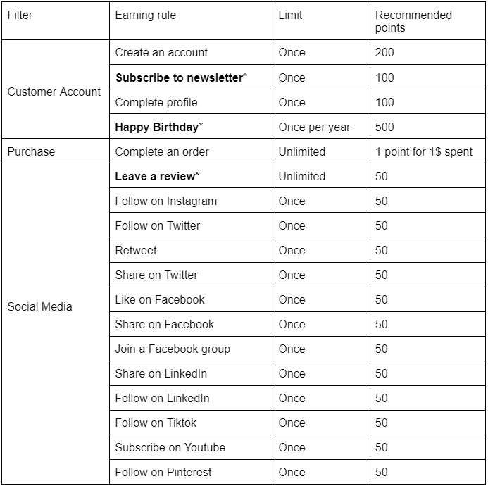 Note: Three point-earning actions written in bold * are available from the Basic plan or higher.