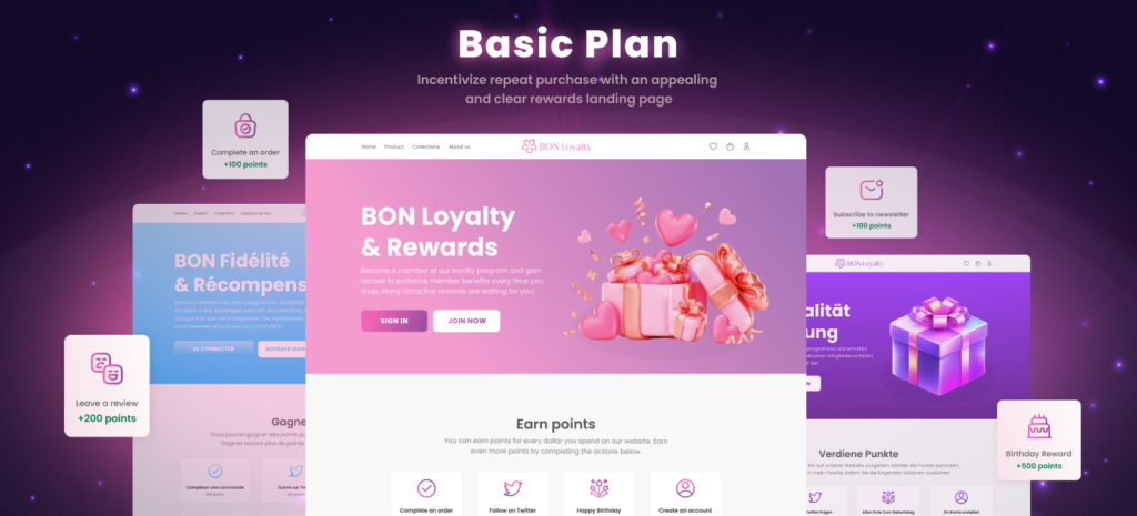 | Advanced points program | The Basic plan offers more ways for your customers to interact with your store. - Leave a review - Happy birthday - Subscribe to Newsletter |