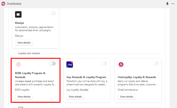 Once you have done that, go to the OneMobile App, then navigate to the Integrations tab. Scroll down to the Loyalty and Rewards section. Here, you will find the BON Loyalty & Rewards program.