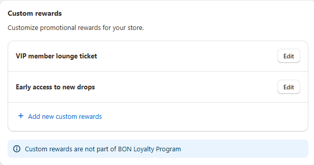Since BON Loyalty is a points-based loyalty program, we primarily focus on points and discount-based rewards. With the Custom reward feature, you can also offer rewards (e.g:, your own merchandise, exclusive tickets to special events, or early access to new collections for your VIP customers, etc.).