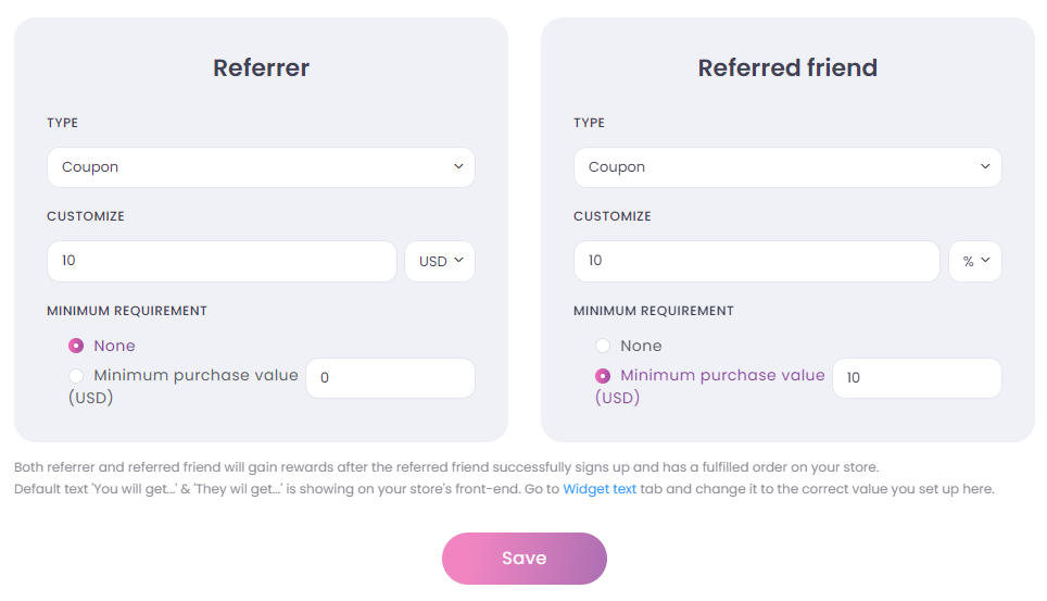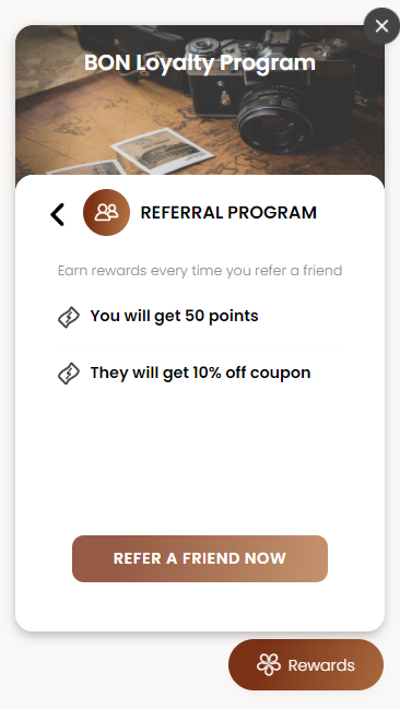 At the moment, when visitors become members of your loyalty program, our system generates a referral link for each of them, which they can use to refer their friends. Once the friends successfully sign up for your program using the referral links, BON recognizes the referral has been completed and gives rewards to both customers and friends.